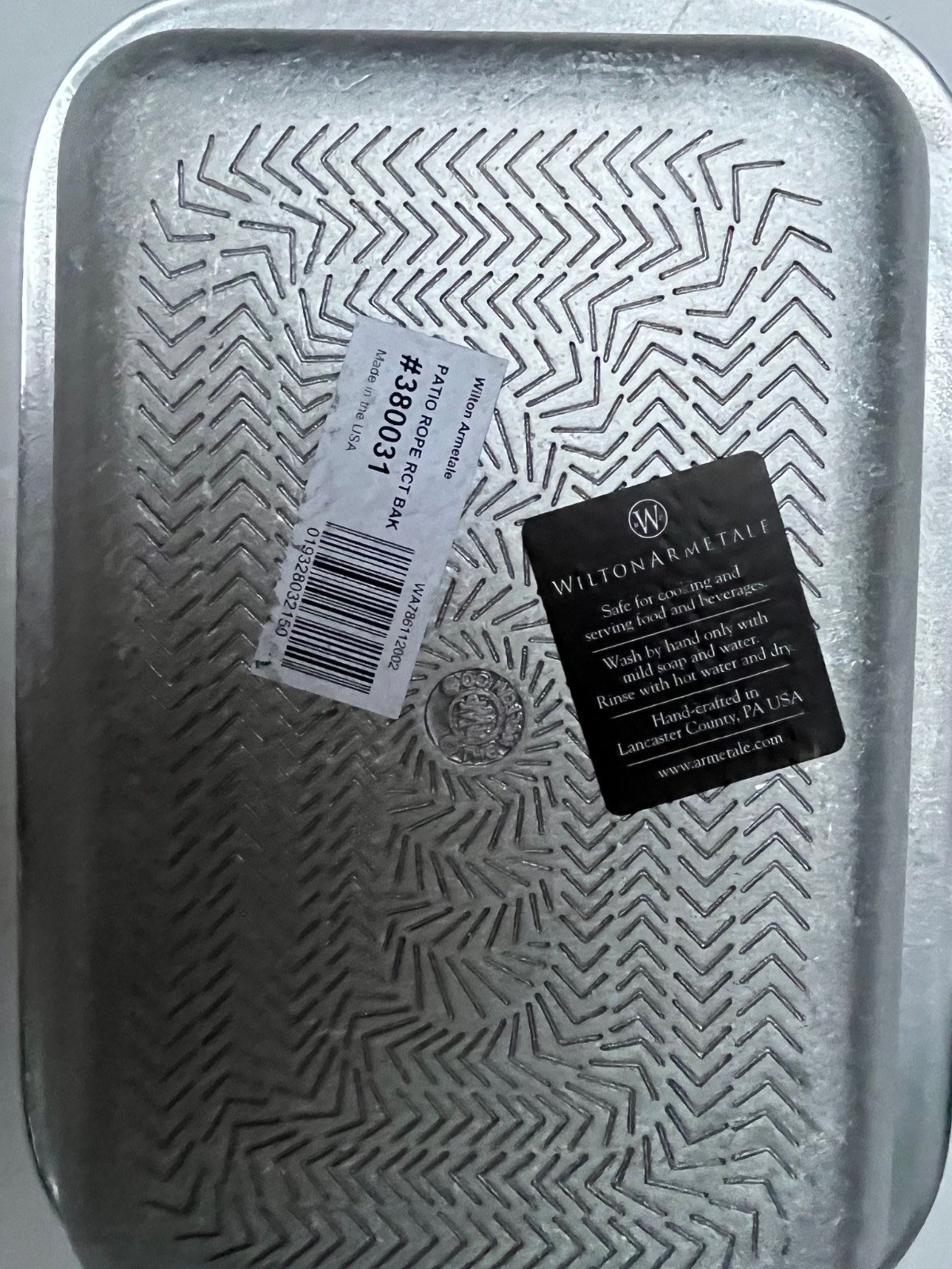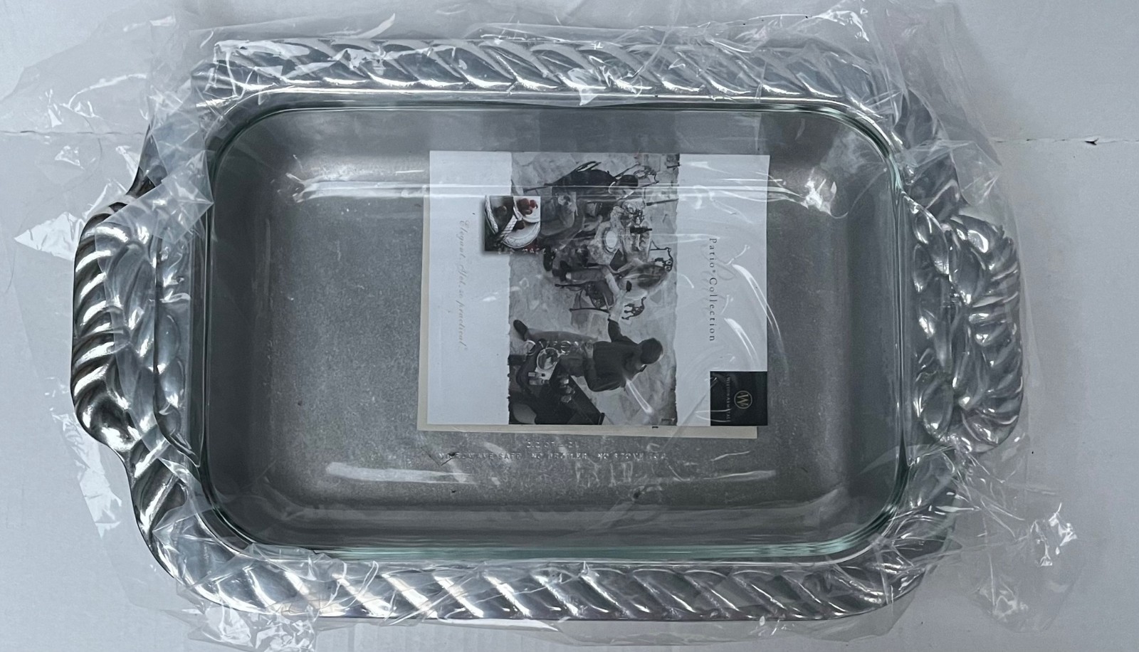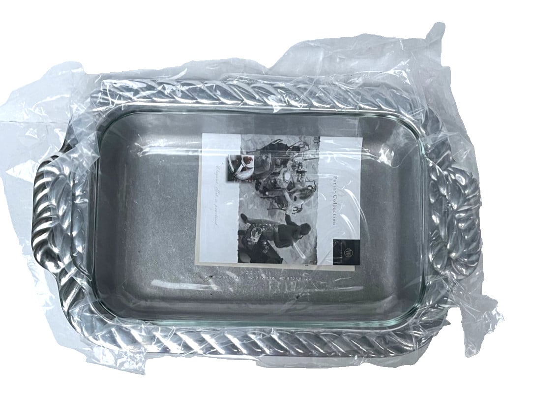 is a brand of serveware and home decor products. Wilton Armetale casserole dish with a detachable glass insert, featuring a rope-style design on the handles. The company, RWP (Ralph Wilton Pewter) The Wilton Company, is known for its durable, food-safe, aluminum-based alloy metal, which is designed to not rust, break, crack, or chip under normal use. The pieces are oven, stove, grill, refrigerator, and freezer-safe, and are designed to keep hot foods hot and cold foods cold for a longer time. It is recommended to hand wash the items with hot soapy water and towel dry, as they are not safe for the dishwasher or microwave